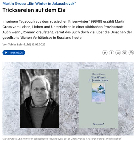 Ein einfühlsames Porträt von Martin Gross, das zugleich Einblicke in sein Schreiben und die Arbeit an der Fortsetzung von „Ein Winter in Jakuschevsk“ vermittelt, ist am 29. Aug. 2022 in der AZ erschienen. Wir freuen uns schon sehr auf dieses Buch!