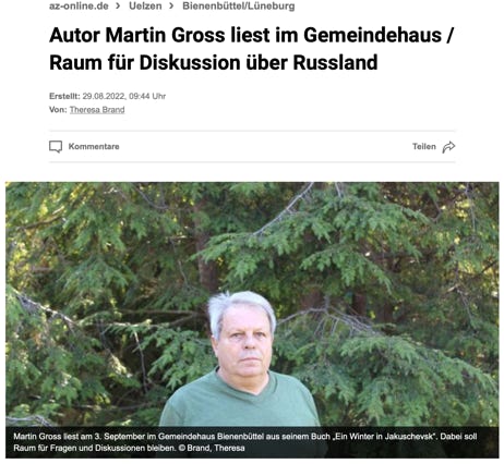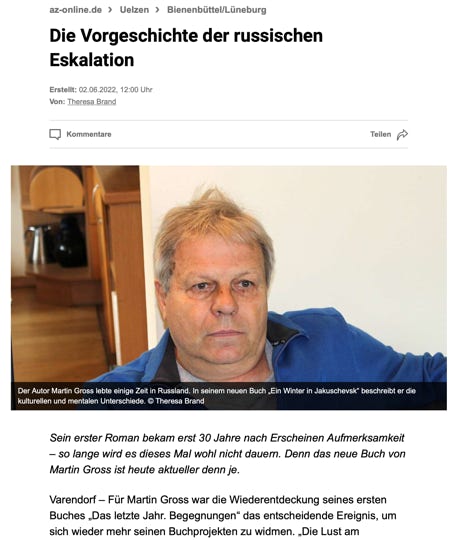02.06.2022 Die Allgemeine Zeitung (AZ) geht in einem Porträt von Martin Gross vor allem auf dessen Erfahrungen in russisch-europäischen Koopera-tionen ein, die den Hintergrund seines neuen Romans Ein Winter in Jakuschevsk bilden. So unterstreicht der Artikel die Bedeutung, die persönlichen – und bei Martin Gross heißt das immer auch: selbst-kritischen – Erfahrungen beikommen, wenn man abweichende Welt-sichten zu verstehen und zu begreifen versucht. Gerade deshalb ist Ein Winter in Jakuschevsk für uns das Buch der Stunde zum Ukraine-Krieg.