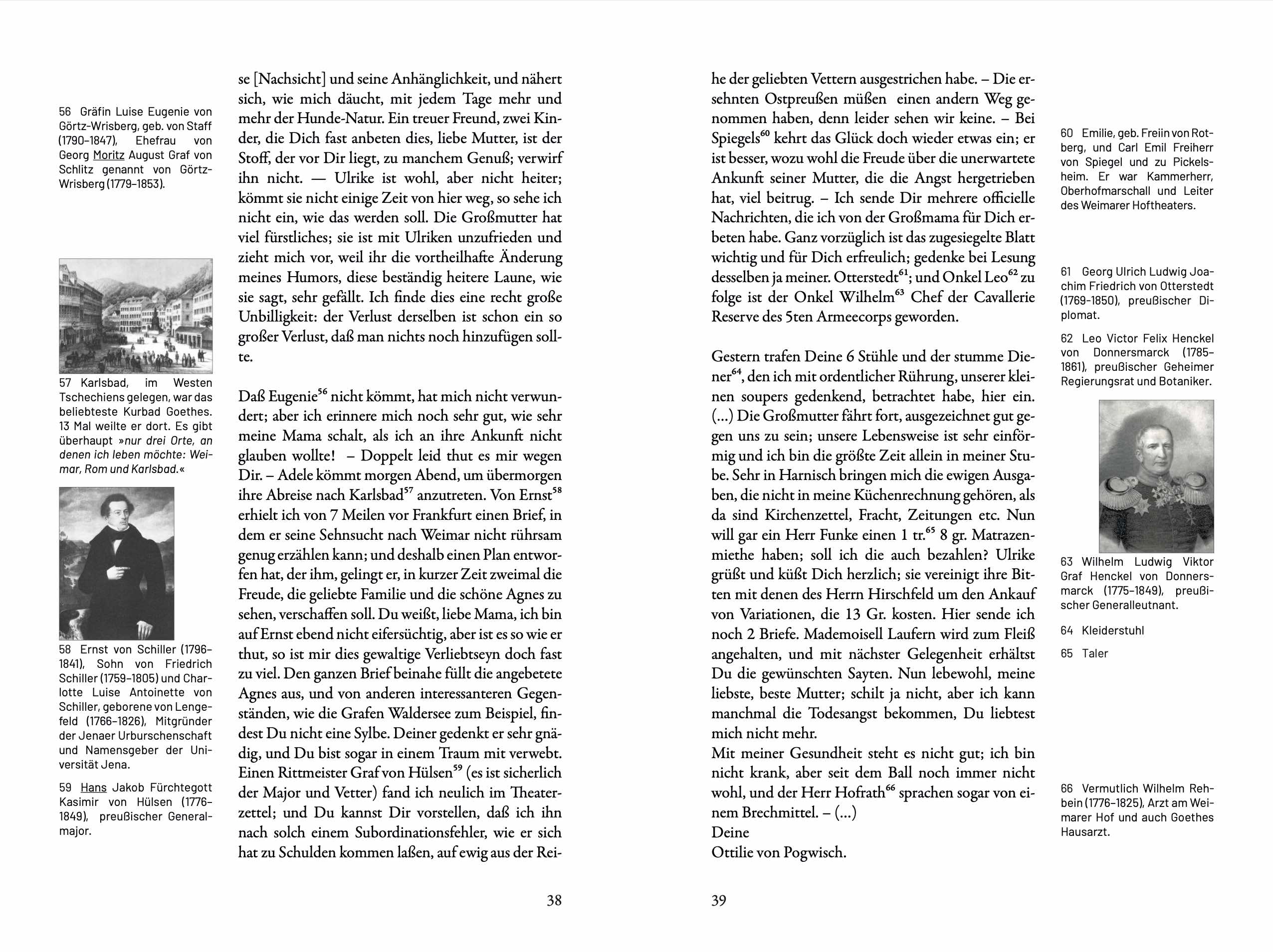 Vieles an Ottilie bleibt zu entdecken, fast alles Bekannte ist zu relativieren. Die junge Ottilie, aus altem Adel, wächst in Weimar bei ihrer Mutter und Großmutter auf, beide Hofdamen des Herzoglichen Hofs, und verfällt, wie so viele ihrer Zeit, Goethes übermächtigem Einfluss. Einem Goethe, der Freiheit und Selbstbestimmung praktiziert, diese auch Ottilie zugesteht und die junge Frau ermuntert, im Fall innerer Gewissheit auf die Konventionen zu pfeifen.