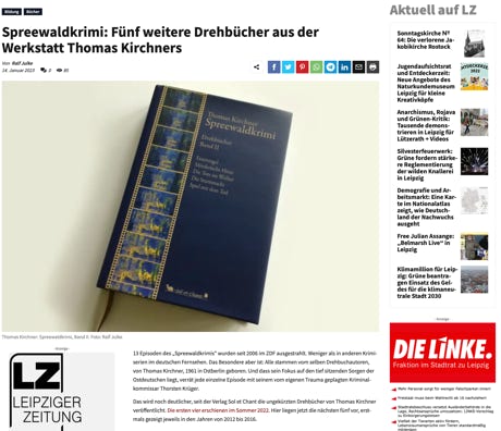 In einer großartig weitsichtigen Rezension des zweiten Bandes unserer Reihe mit Drehbüchern zu Thomas Kirchners Spreewaldkrimis öffnet Ralf Julke (Leipziger Zeitung) den Blick für die weiter reichende – und damit literarische und politische – Bedeutung von Kirchners Krimireihe.